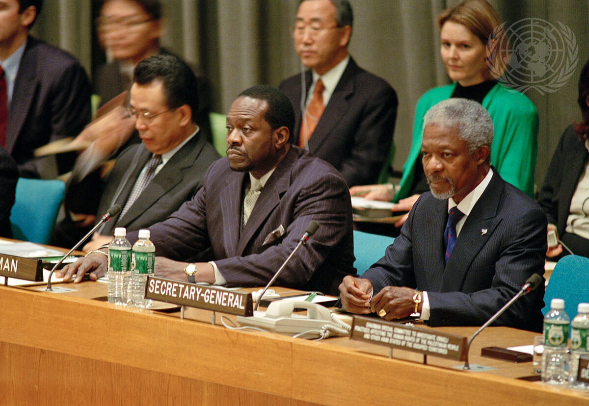 Chairman of the Committee on the Exercise of the Inalienable Rights of the Palestinian People, Papa Louis Fall (centre) addresses those attending today's annual observance. Secretary-General Kofi Annan is at right and Han Seung-soo, President of the fifty-sixth session of the General Assembly is at left.
