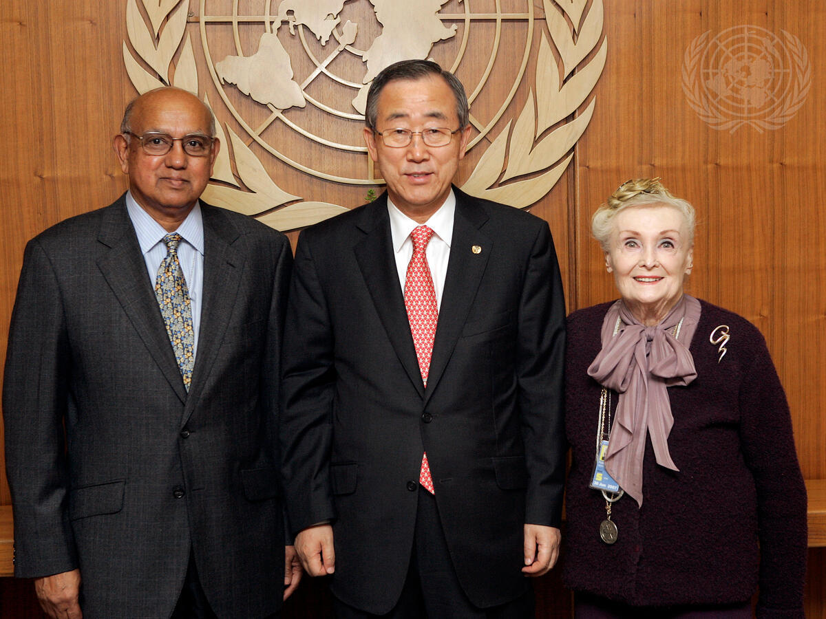 Secretary-General Ban Ki-moon (centre) meets with Satya Nandan (left), Chairman of the Board of Trustees of the UN International School (UNIS) and Secretary-General of the International Seabed Authority; and Sylvia Howard Fuhrman, Special Representative of the Secretary-General for UNIS, at UN Headquarters in New York.