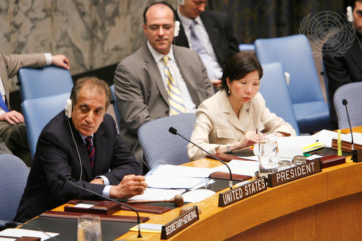 Zalmay Khalilzad (left), Permanent Representative of the United States to the United Nations, addresses the Security Council during the consideration of the Report of the Council's mission on Kosovo, to obtain first-hand information on progress made since the adoption of resolution 1244 (1999), at UN Headquarters in New York.