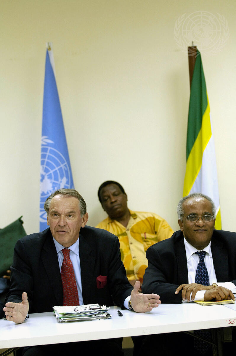 United Nations Special Envoy for Darfur, Jan Eliasson (left) and his African Union counterpart, Salim Ahmed Salim (right) jointly brief the internationnal community ambassadors at the end of their two-day visit to Sudan, in Khartoum.