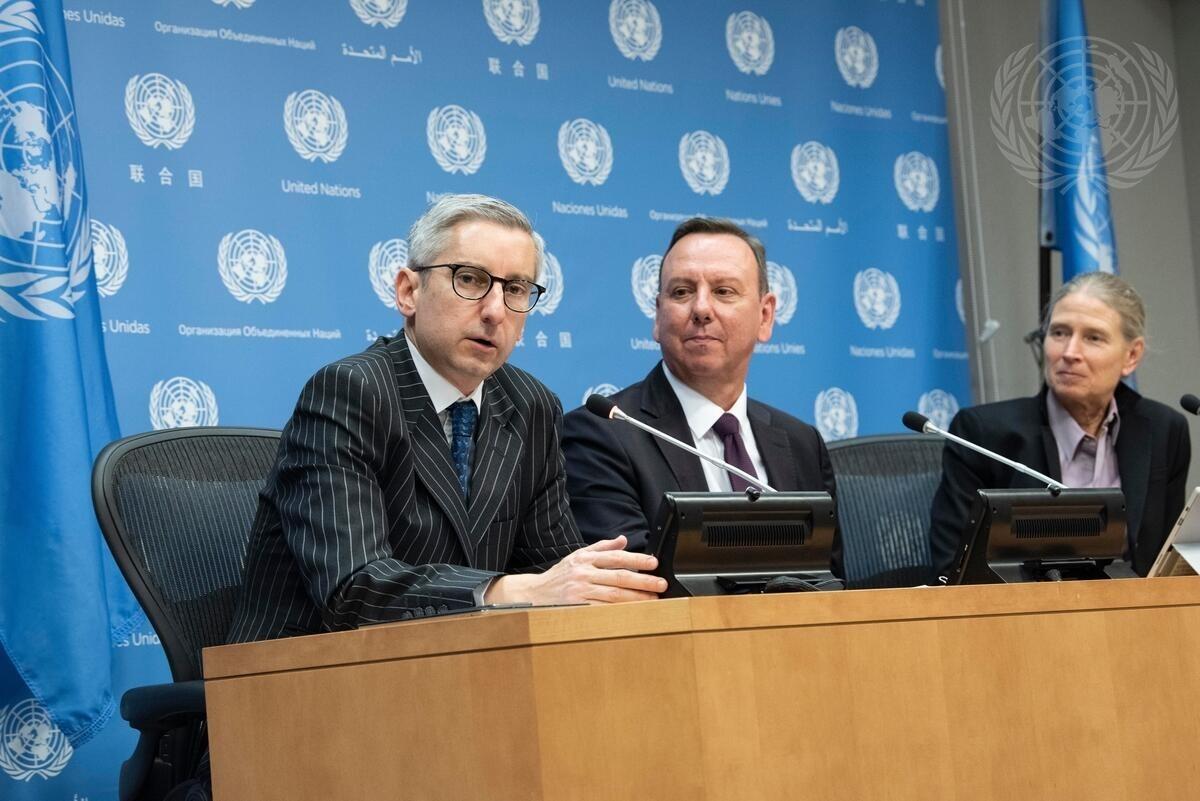 Jean Rodriguez, Spokesperson for United Nations Economic Commission for Europe (UNECE), speaks at a press briefing sponsored by the Climate Action Summit on nature-based solutions for cities. With him are, in the centre, Gino van Begin, Secretary General of Local Governments for Sustainability (ICLEI), and at right, Frances Seymour, Distinguished Senior Fellow at World Resources Institute.