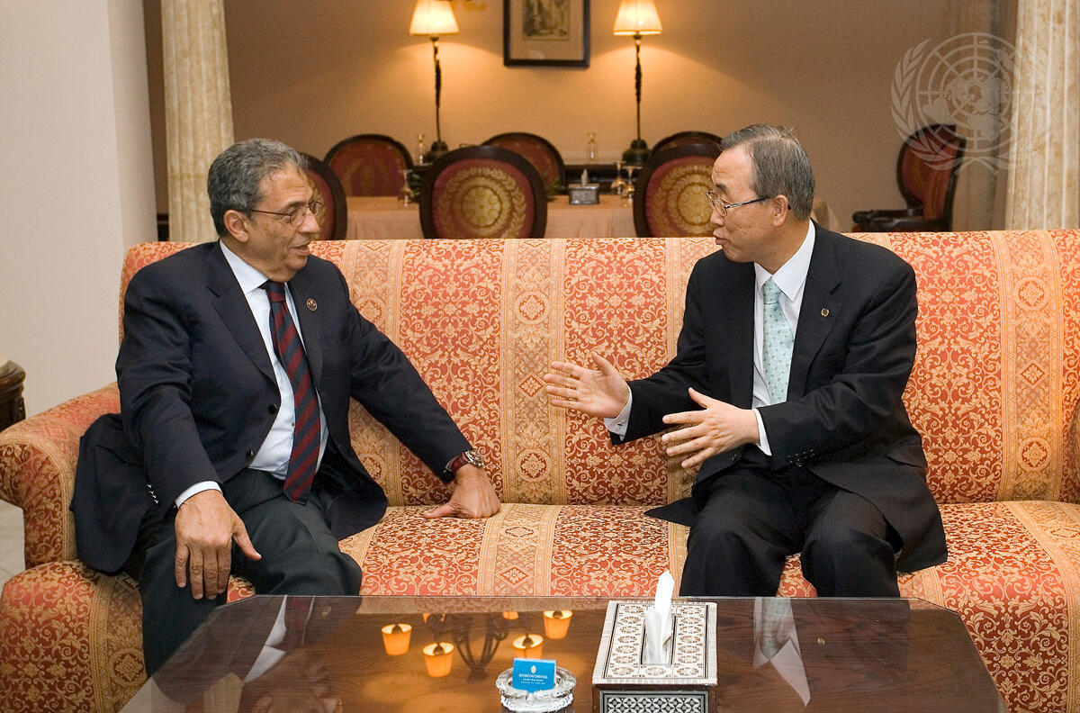 Secretary-General Ban Ki-moon (right) meets with Amre Moussa, Secretary-General of the League of Arab States in Sharm El-Sheikh, Egypt.