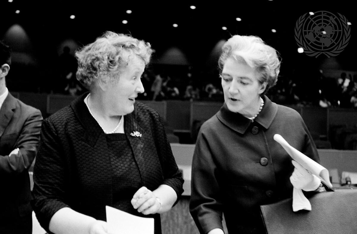 Seen here at the meeting in conversation are: (l. to r.): Miss J.A.C. Gutteridge (United Kingdom); and Ambassador Agda Rossel, Permanent Representative to the U.N. (Sweden).