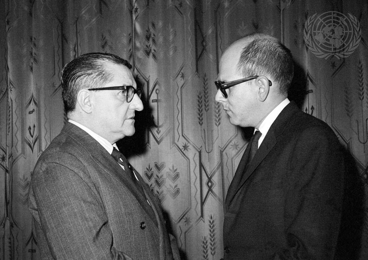 Senator Afonso Arinos de Melo Franco (left) of Brazil, and Dr. Mario Garcia-Inchaustegui of Cuba, are seen conferring prior to the meeting.