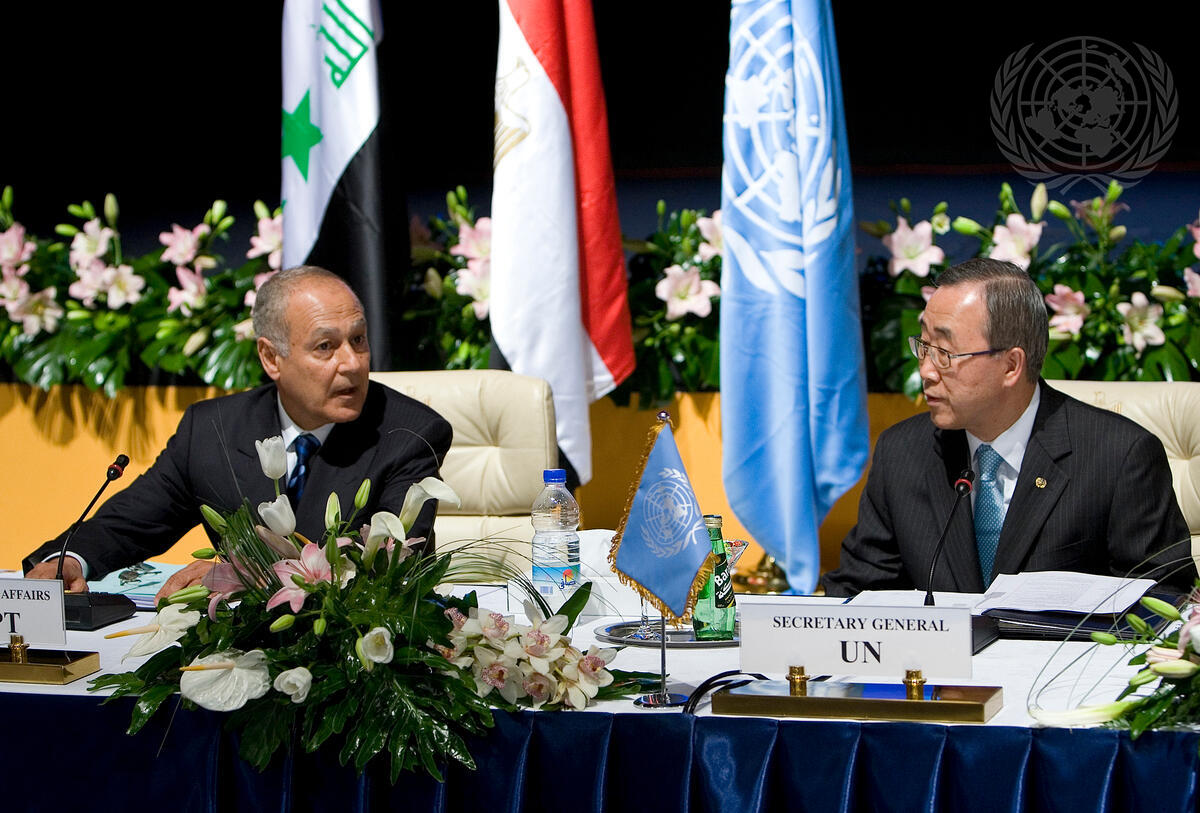 Secretary-General Ban Ki-moon (right) and Ahmed Aboul Gheit, Foreign Minister of the Arab Republic of Egypt, are at the launch of the International Compact with Iraq in Sharm El-Sheikh, Egypt.