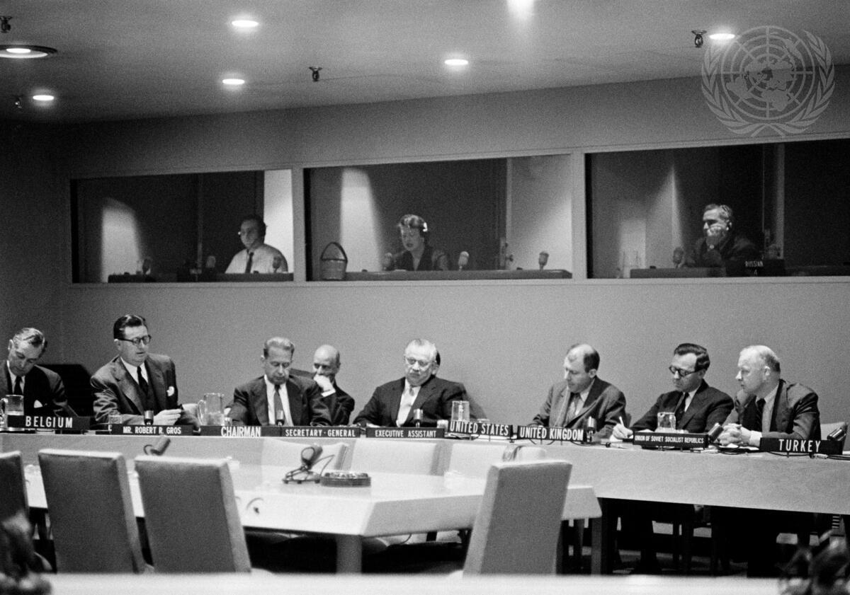Here is a partial view of the meeting. From left to right are: Jules Woulbourn, Belgium; Robert R. Gros, San Francisco; Secretary-General Dag Hammarskjöld; Andrew W. Cordier, Executive Assistant to the Secretary-General; William O. Hall, United States; P.E. Ramsbotham, United Kingdom; and Georgy F. Saksin, USSR.
