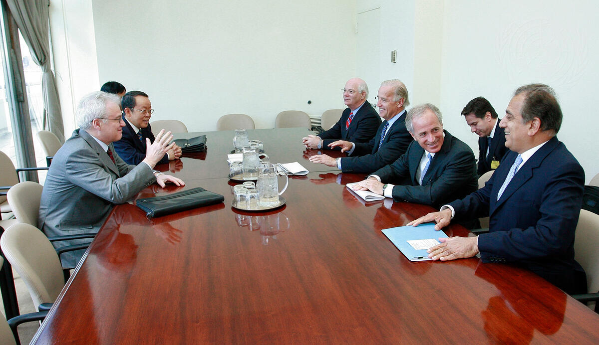 A delegation of United States senators (left) meets with the representatives of the five permanent members of the UN Security Council - China, France (did not attend), the Russian Federation, United Kingdom and United States of America, at UN Headquarters in New York.