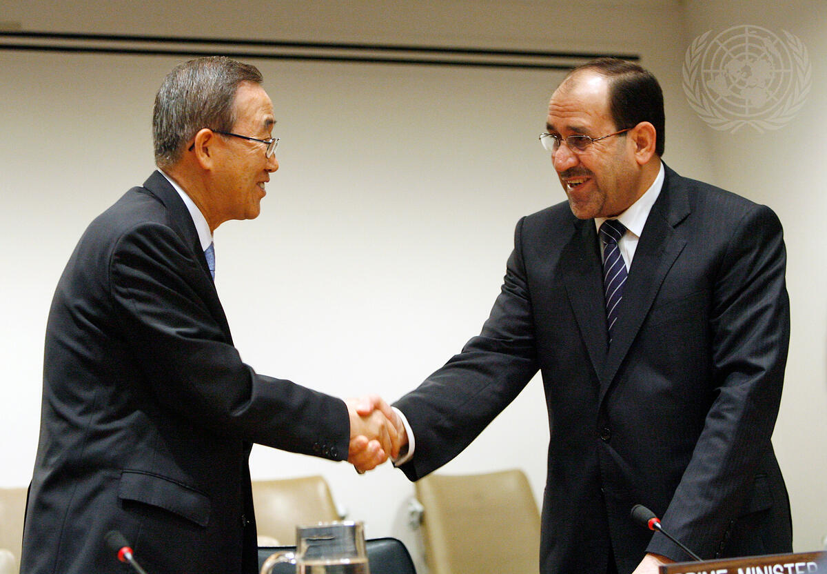 Secretary-General Ban Ki-moon shakes hands with Nouri Kamel al-Maliki, Prime Minister of Iraq, at the end of their joint press conference, following the high-level talks on the situation in Iraq.
