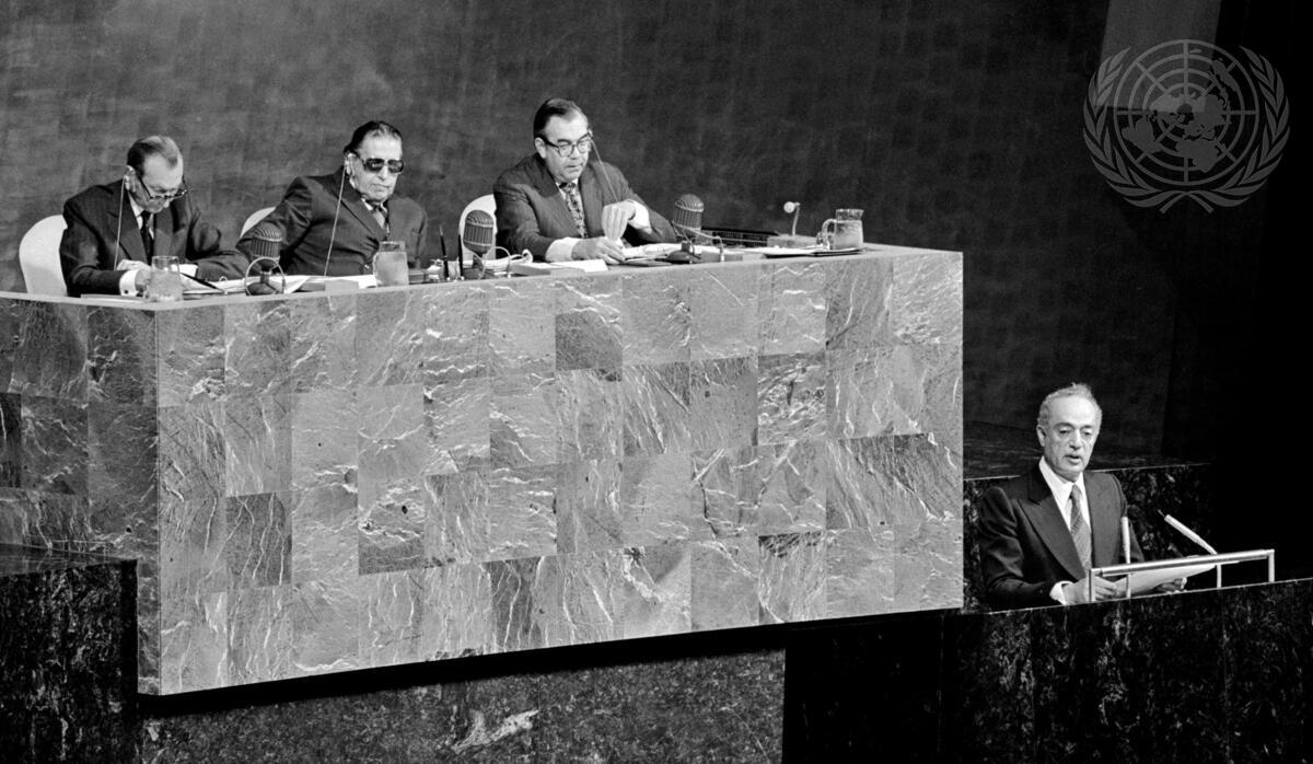 Alsayyed Omar Sakkaf, Minister of State for Foreign Affairs of Saudi Arabia, makes his statement. Seated (l. to r.) at the presidential rostrum are Secretary-General Kurt Waldheim, Leopoldo Benites (Ecuador), President of the Assembly, and Bradford Morse, Under-Secretary-General for Political and General Assembly Affairs.