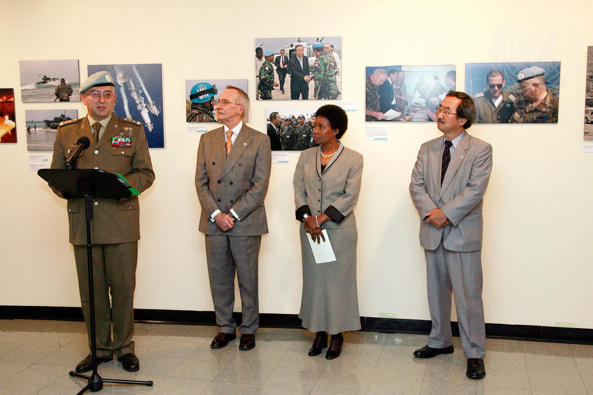 Major General Claudio Graziano (left, at microphone), Force Commander of the United Nations Interim Force in Lebanon (UNIFIL) speaks at the formal opening of the exhibition marking the anniversary of the adoption of the Security Council of resolution 1701 on the hostilities in Israel and Lebanon, at UN Headquarters in New York.