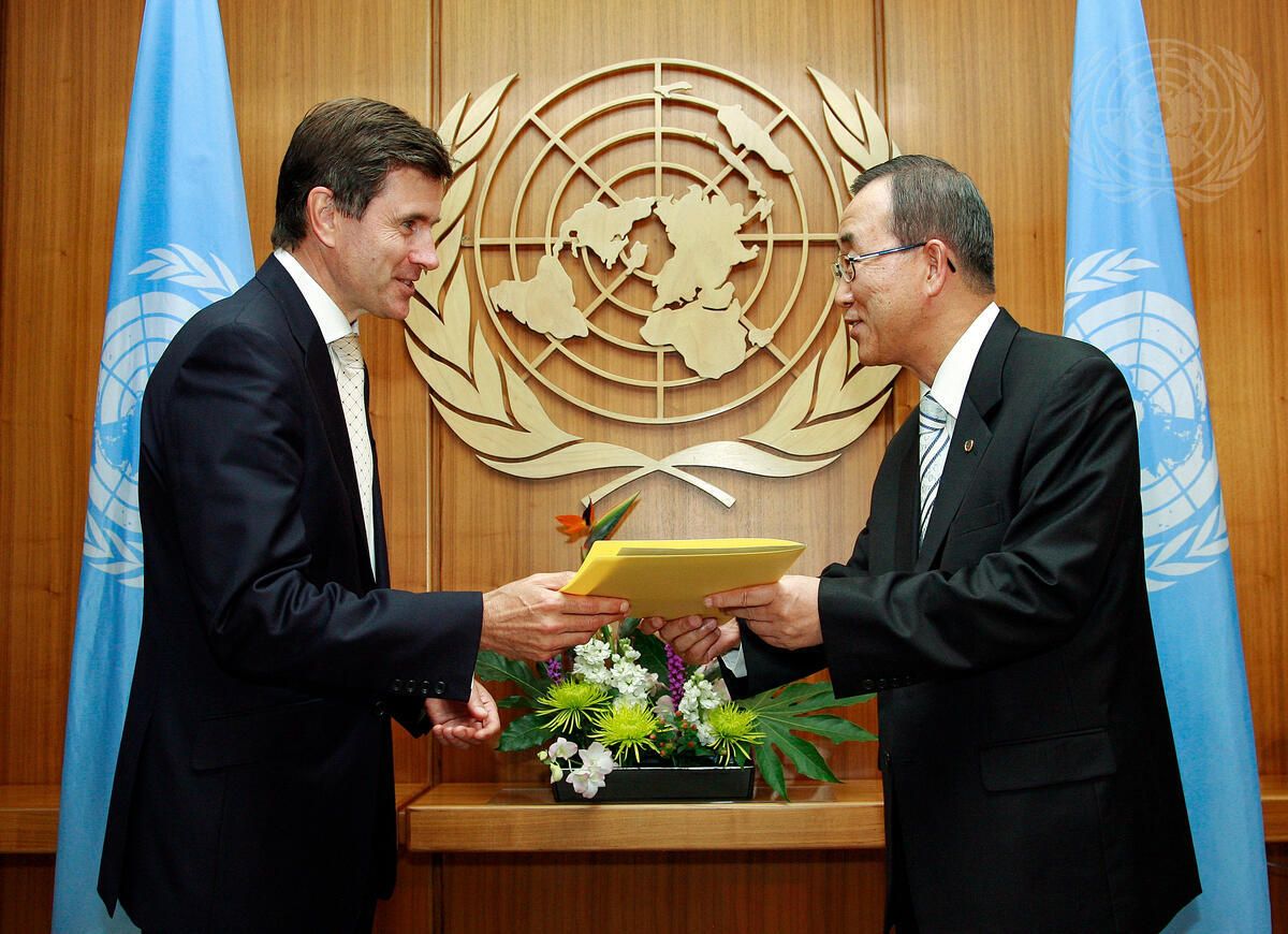 John Sawers (left), new Permanent Representative of the United Kingdom of Great Britain and Northern Ireland to the United Nations, presents his credentials to Secretary-General Ban Ki-moon, at UN Headquarters in New York.