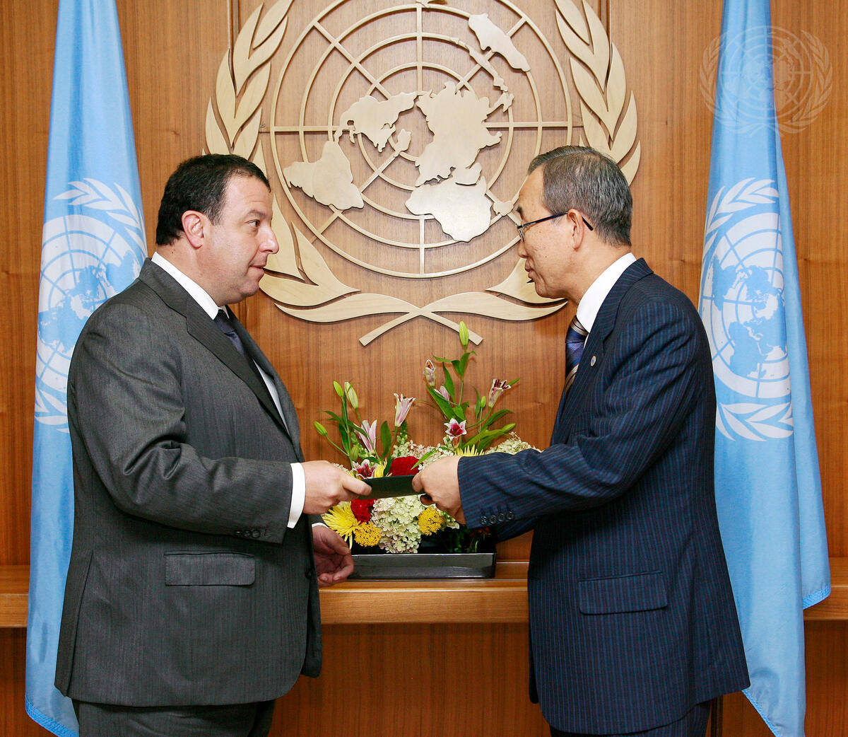 Carles Font-Rossel (left), new Permanent Representative of Andorra to the United Nations, presents his credentials to Secretary-General Ban Ki-moon.