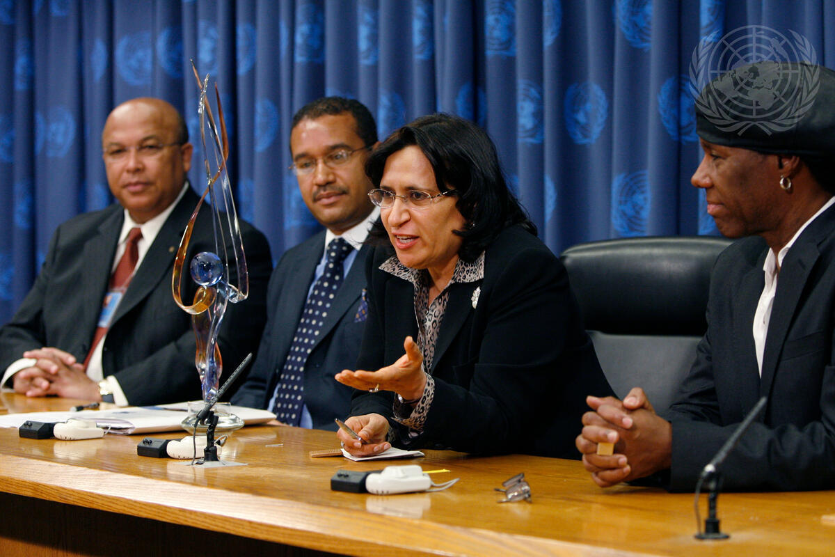 Haya Rashed Al Khalifa (second from right), President of the sixty-first session of the General Assembly, speaks at a press conference announcing the plans for a UN Millennium Developmetn Goals Award Festival, at UN Headquarters in New York.