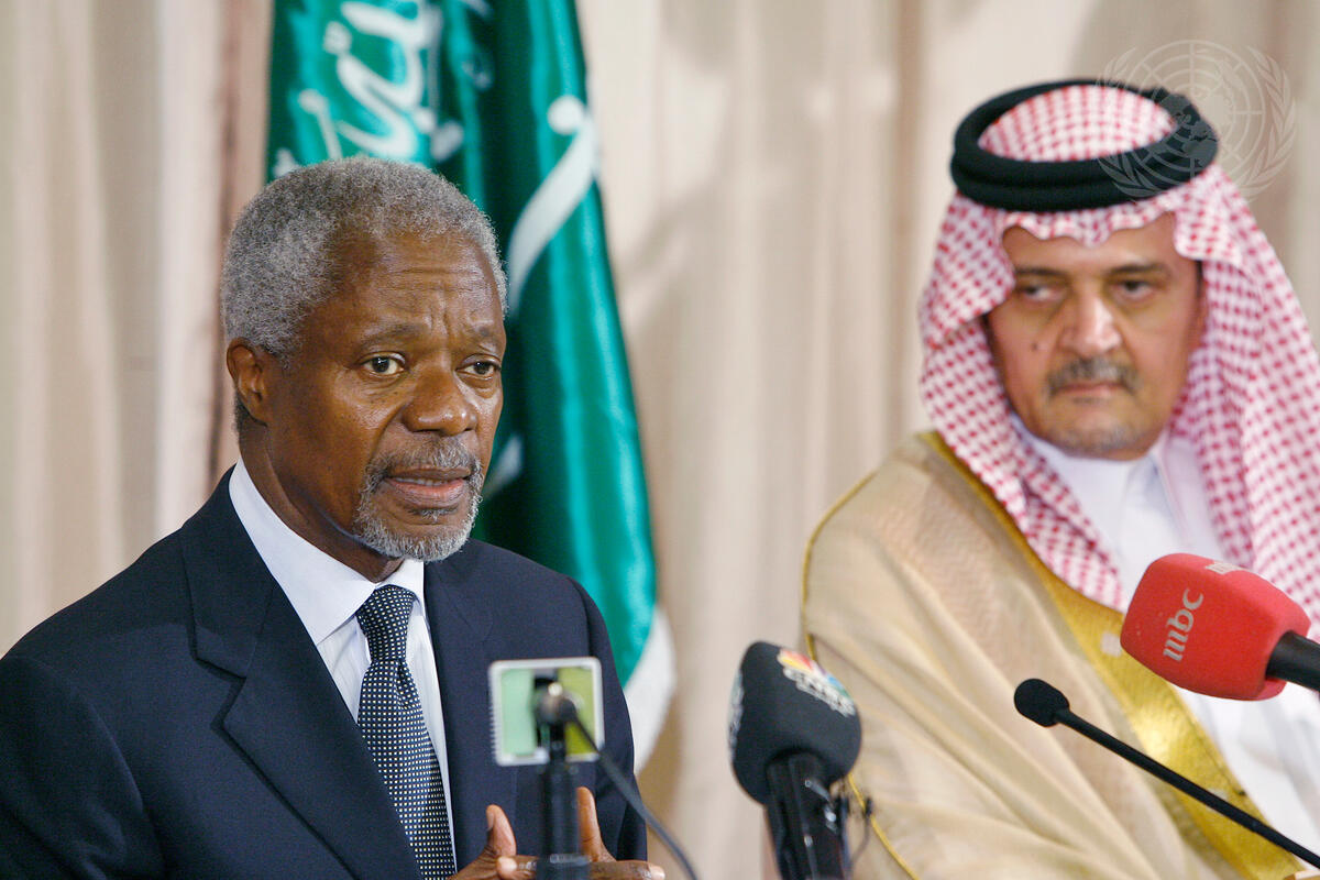 Secretary-General Kofi Annan (left) holds a joint press conference with the Foreign Minister of Saudi Arabia, Saud Al-Faisal, in Jeddah.