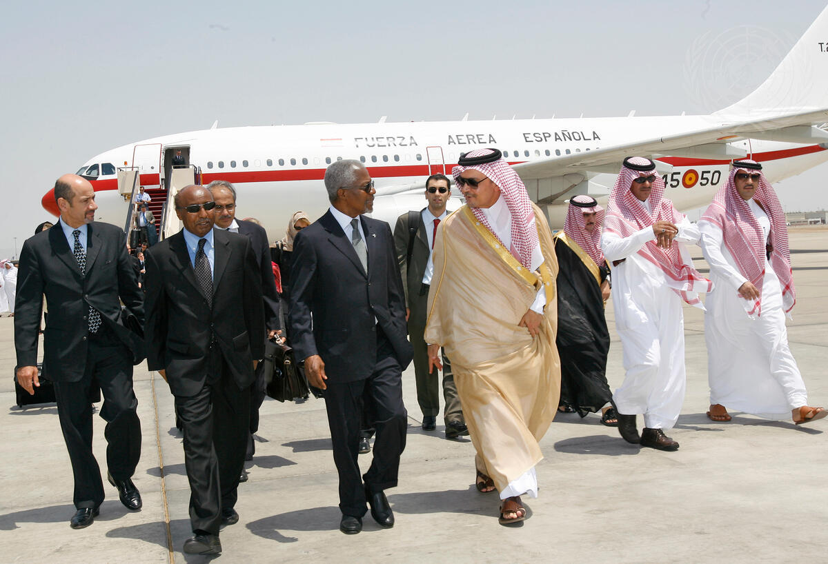 Saudi Arabian Foreign Minister Saud Al-Faisal (right, front) welcomes United Nations Secretary-General Kofi Annan (third from left, front), at the airport in Jeddah.