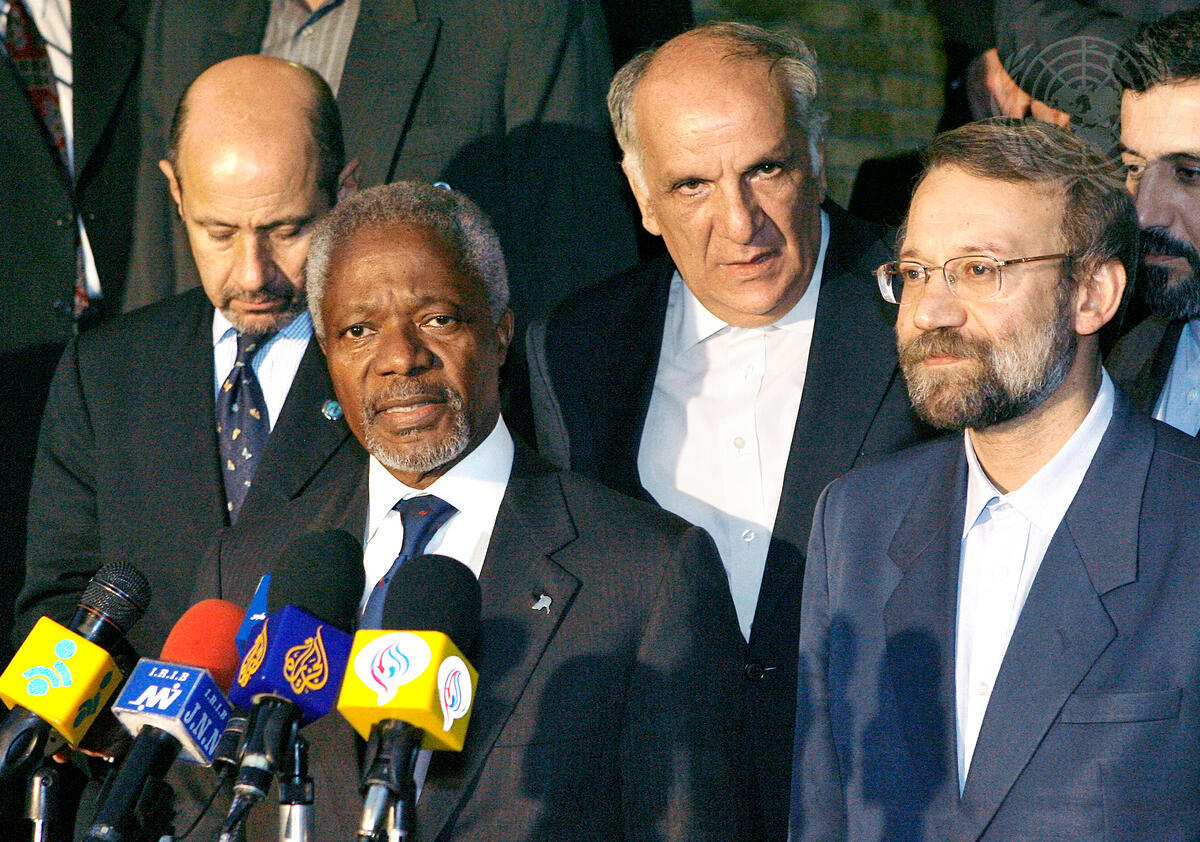 Secretary-General Kofi Annan (second from left) and Ali Larijani (right), Secretary of Iran's Supreme National Security Council, brief correspondents following their meeting in Teheran.