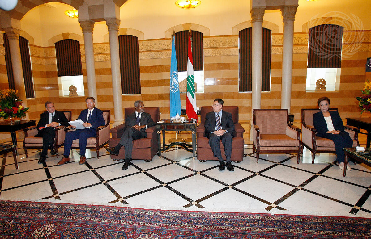 Secretary-General Kofi Annan (third from left) is pictured with Prime Minister Fouad Siniora of Lebanon and some members of his cabinet, at Grand Serail in Beirut, Lebanon.