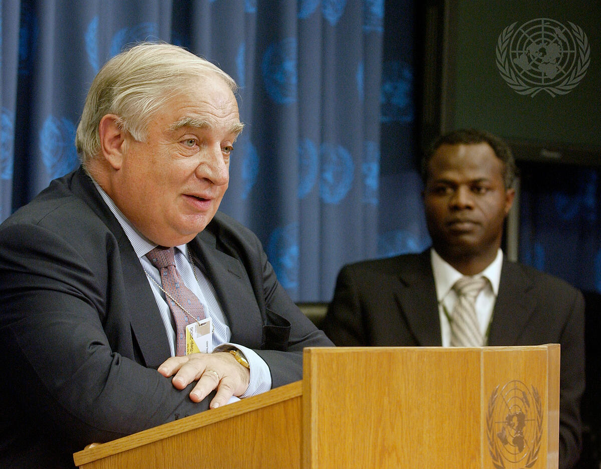 Peter Sutherland (left), Special Representative of the Secretary-General for Migration, briefing correspondents on the General Assembly High-level Dialogue on International Migration and Development, at United Nations Headquarters in New York. At right is Yves Sorokobi, Associate Spokesman for the Secretary-General.