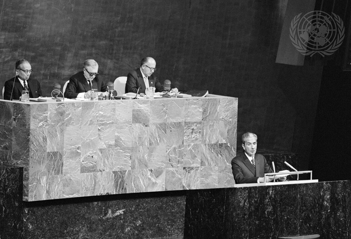 Aldo Moro, Foreign Minister of Italy, addressing the General Assembly. Seated at the presidential rostrum, from left to right are: UN Secretary-General, U Thant; Edvard Hambro (Norway), President of the General Assembly; and Constantin A. Stavropoulos, Under-secretary-General for General Assembly Affairs.