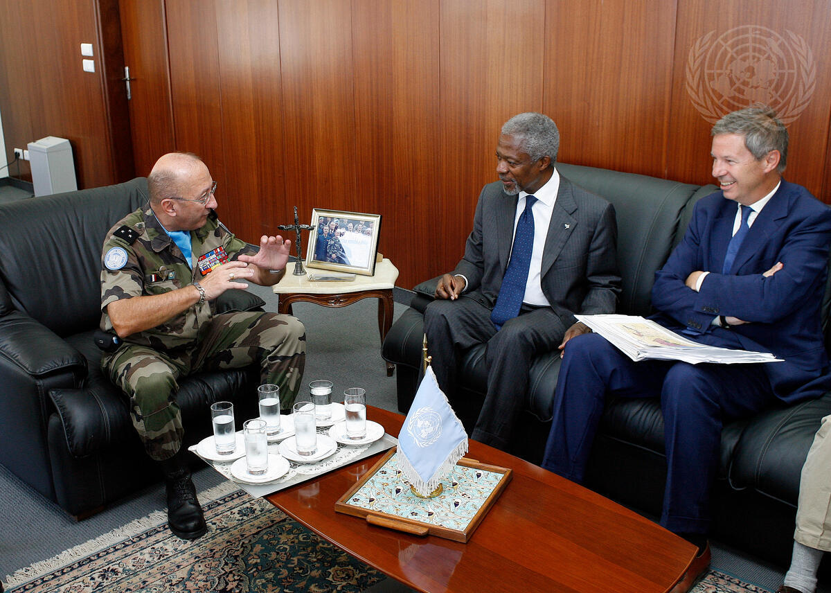 Secretary-General Kofi Annan (centre) meets with Major-General Alain Pellegrini (left), Force Commander of the United Nations Interim Force in Lebanon (UNIFIL). Jean-Marie Guéhenno, Under-Secretary-General for Peacekeeping Operations, is at right.