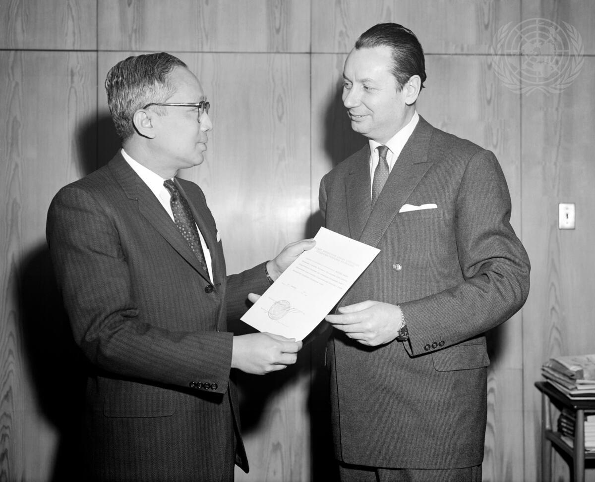 Ambassador Nikolai Trofimovich Fedorenko (right), the new Permanent Representative of the Soviet Union to the United Nations, is seen as he presented his credentials to Secretary-General U Thant this morning. He succeeds Ambassador Valerian Aleksandrovich Zorin, who has returned to the USSR.
