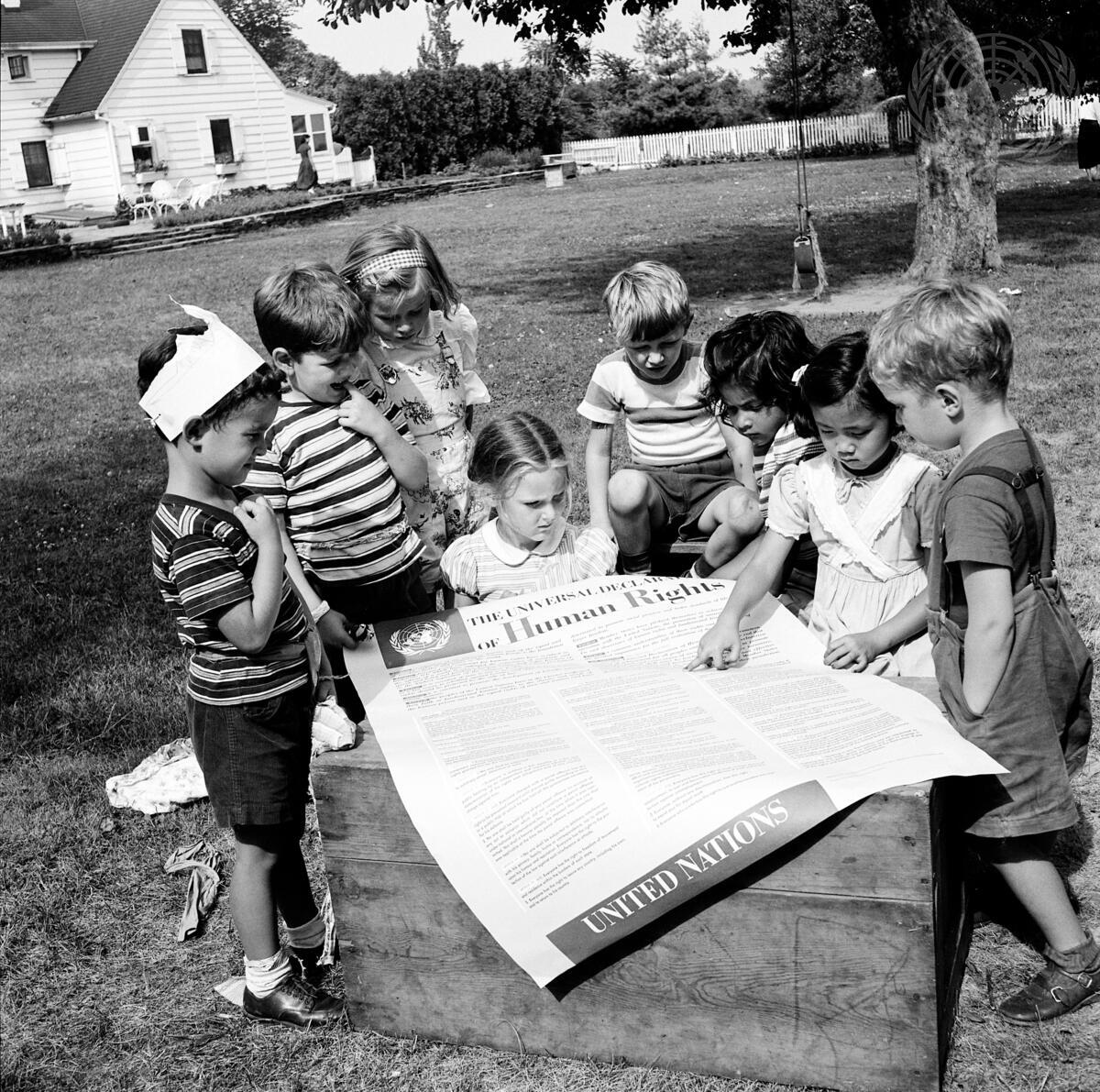 These children of United Nations staff members are getting a closer look at the Universal Declaration of Human Rights, which is two years old on 10 December. All nations in the world have been invited to set aside 10 December of every year as Human Rights Day and through programs in schools and community centers to pay hommage to the principles of freedom and of the dignity of men.