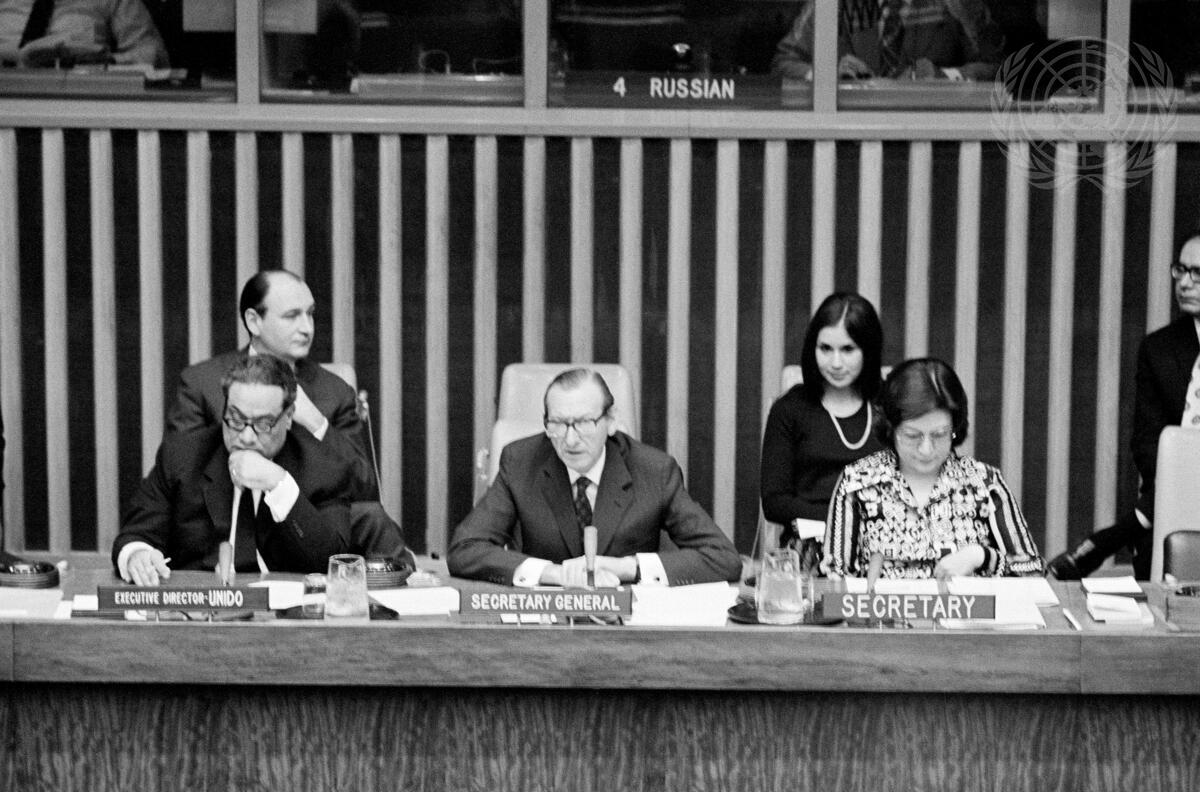 Secretary-General Kurt WALDHEIM is seen making a statement as he opened the Conference this morning. At left is Ibrahim Helmi ABDEL-RAHMAN, Under-Secretary-General, Executive Director of UNIDO. At right is Falha KAMAL, Secretary of the Conference.