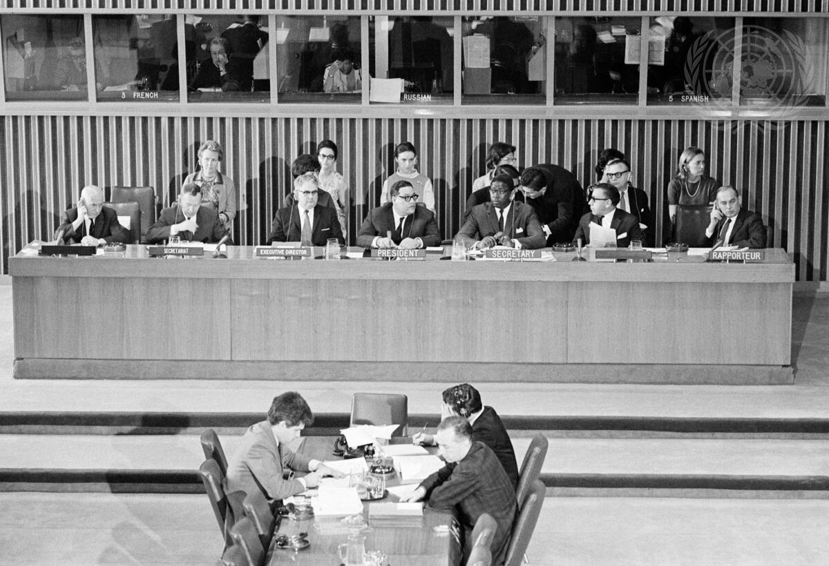 Ibrahim Helmi ABDEL-RAHMAN (centre), Executive Director of UNIDO, reading the message from the Secretary-General. At the table, left to right: H.W. SINGER, Director of the Policies and Programming Division, UNIDO; N. K. GRIGORIEV, Director of the Technology Division, UNIDO; J. T. BIRCKHEAD, Acting Director for Administration and Finance, UNIDO; Mr. Abdel-Rahman; Almamy SYLLA, Secretary of the Board; S. QUIJANO-CABALLERO, Director of the Technical Co-operation Liaison Bureau, UNIDO; and R.L. OSHINS, Director of Industrial Seminars and Institutions Division, UNIDO.