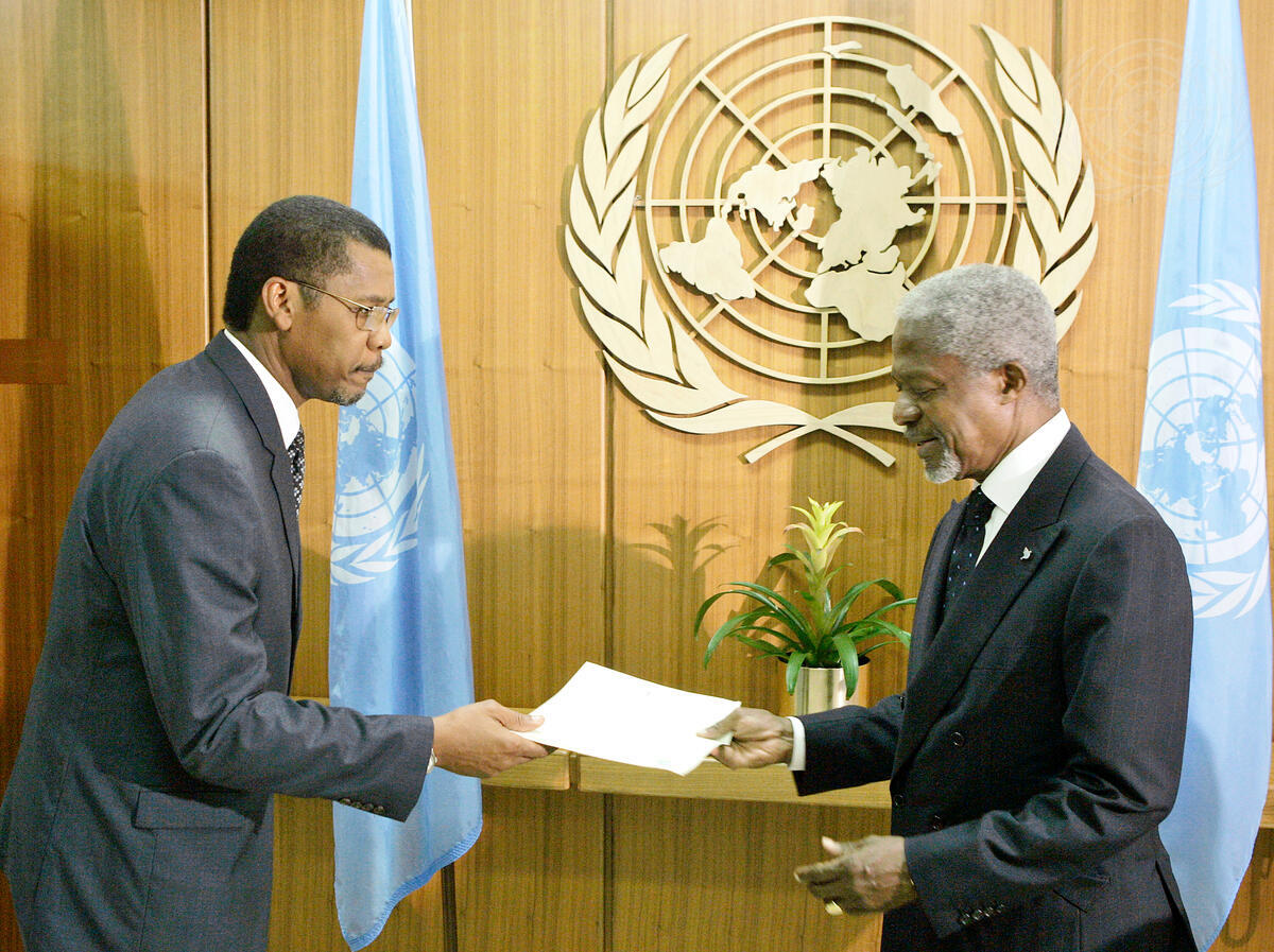 Milton Nathaniel Barnes (left), the new Permanent Representative of the Republic of Liberia to the United Nations, presents his credentials to Secretary-General Kofi Annan, at UN Headquarters in New York.