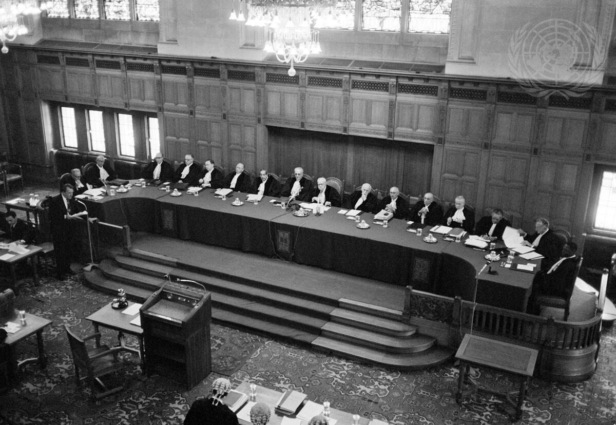 Photograph shows judges of the Court listening to consecutive translation. They are (right to left): Mr. Philemon Beb a Don (judge ad hoc); Mr. Philip C. Jessup (United States); Mr. K. Tanaka (Japan); Sir Gerald Fitzmaurice (United Kingdom); Mr. J. Spiropoulos (Greece); Mr. L. M. Moreno Quintana (Argentina); Mr. J. Basdevant (France); Mr. B. Winiarski (Poland), President; Mr. R.J . Alfaro (Panama), Vice-President; Mr. A.H. Badawi (United Arab Republic); Mr. V.K. Wellington Koo (China); Sir Percey Spender (Australia); Mr. V.M. Korestsky (USSR); Mr. J.L. Bustamante Y Rivero (Peru); Mr. G. Morelli (Italy); and Mr. Jean Garnier-Coignet, the Registrar of the Court.