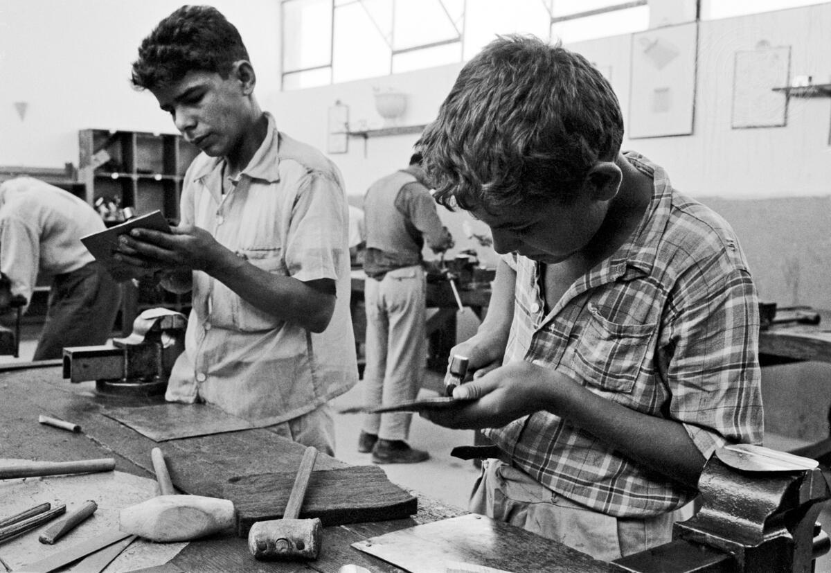 Young refugees doing metal work in a secondary class in the school at Ein Sultan camp in Jericho, Jordan.