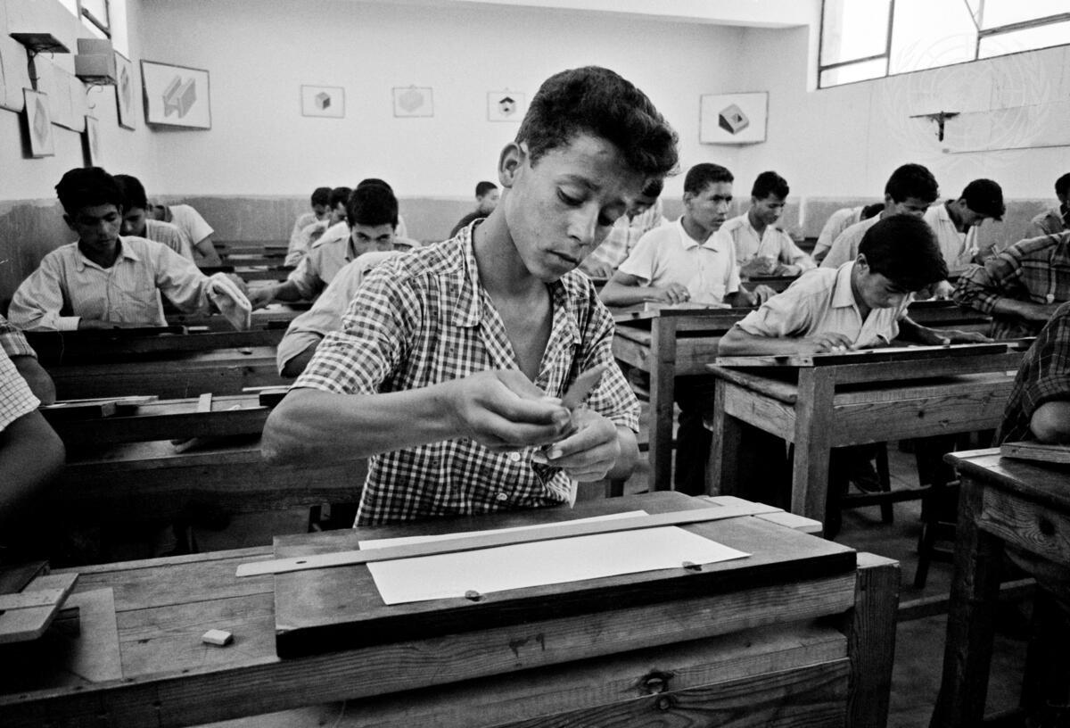 Young refugees are seen here at work in the technical drawing class in the elementary school of Ein Sultan camp in Jericho, Jordan.