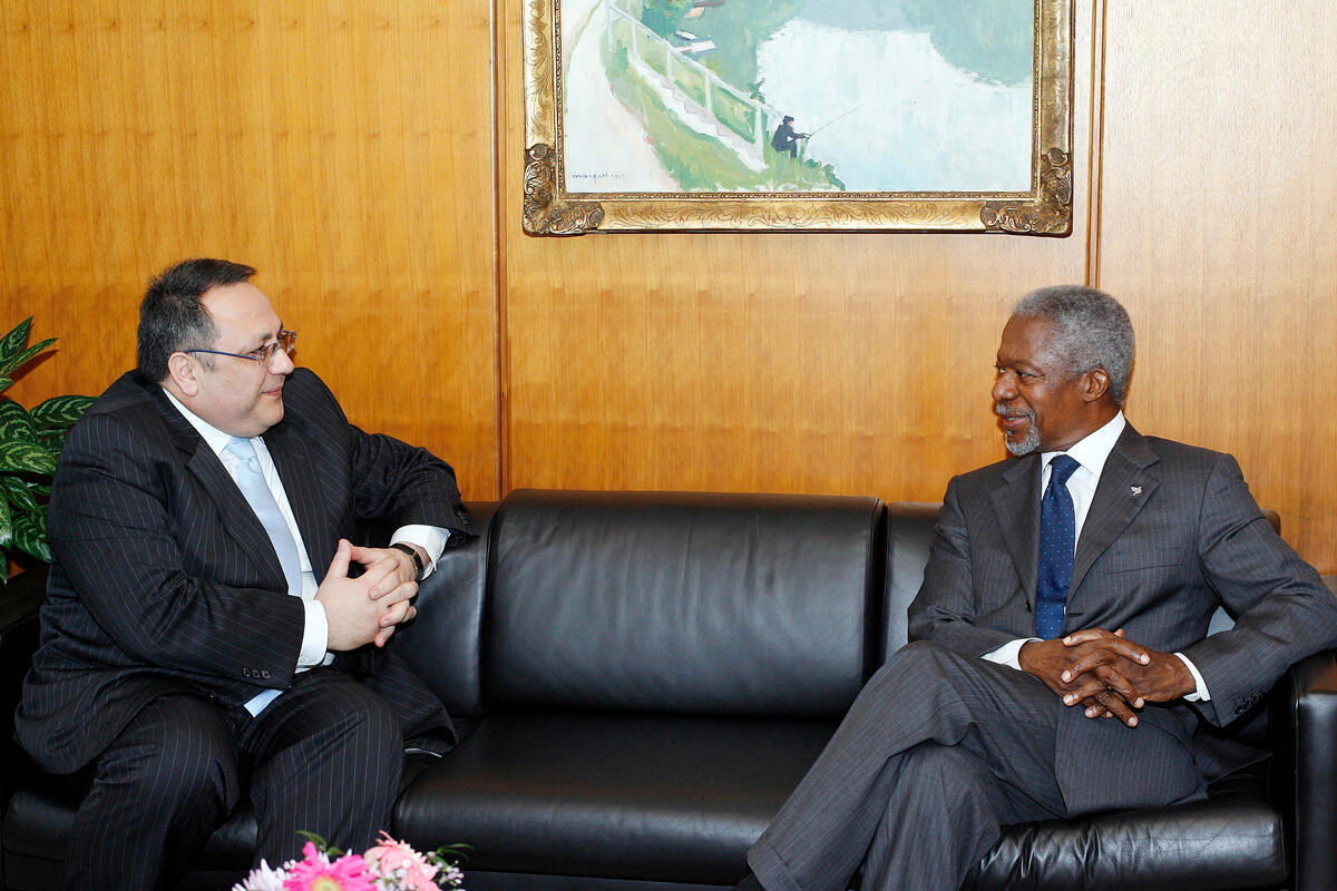Secretary-General Kofi Annan (right) meets Yashar Aliyev, Permanent Representative of Azerbaijan to the United Nations, who paid him a farewell call, today, at UN Headquarters in New York.