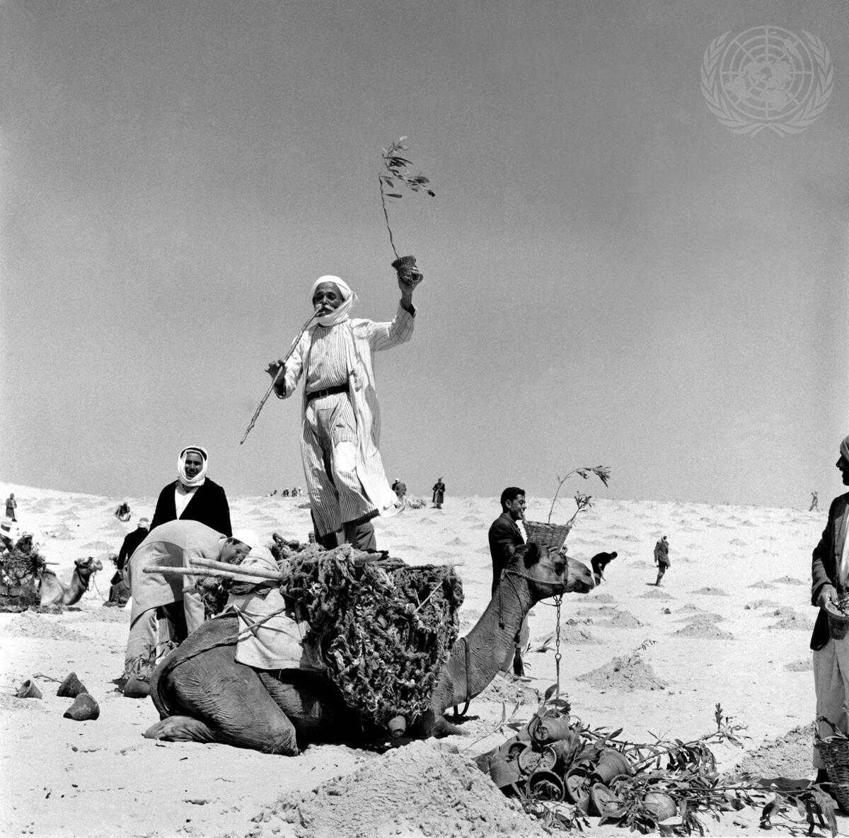 Some 900,000 refugees are still on the rolls of UNRWA, the United Nations Relief and Works Agency for Palestine Refugees. The Agency is providing food, medical care and shelter as well as helping the refugees to become self-supporting where possible. Afforestation plantings to reclaim dry areas in Gaza Strip. 1957.