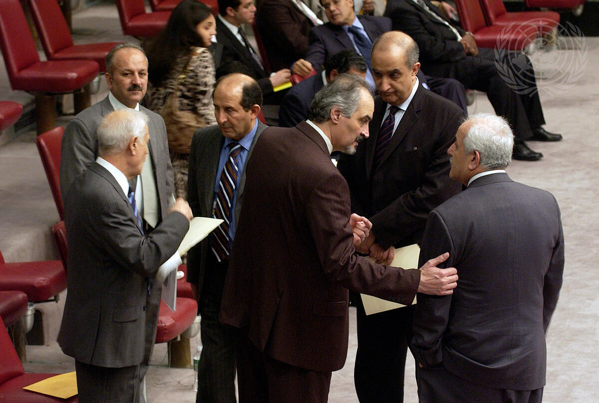 Bashar Ja'afari (centre), Permanent Representative of the Syrian Arab Republic to the United Nations, is seen here holding informal discussions with Riyad H. Mansour (back to camera, right), Permanent Observer of the Permanent Observer Mission of Palestine to the United Nations, before the start of the Security Council meeting on the Middle East.