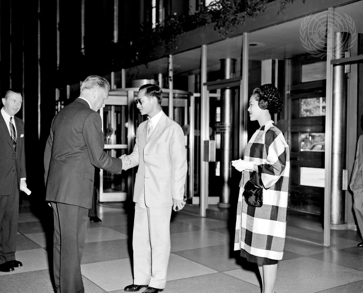 King Bhumibol Adulyajed (centre), and Queen Sirikit of Thailand are greeted by U.N. Secretary-General Dag Hammarskjöld, upon arrival at UN Headquarters in New York.