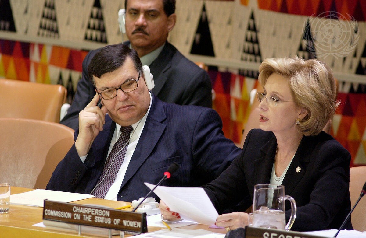 Ali Hachani (left), President of the Economic and Social Council (ECOSOC), listens to Carmen Maria Gallardo Hernandez (right), chairperson of the Commission on the Status of Women (CSW), deliver her remarks at the roundtable meeting held at UN Headquarters to commemorate the sixtieth anniversary of the Commission on the Status of Women.