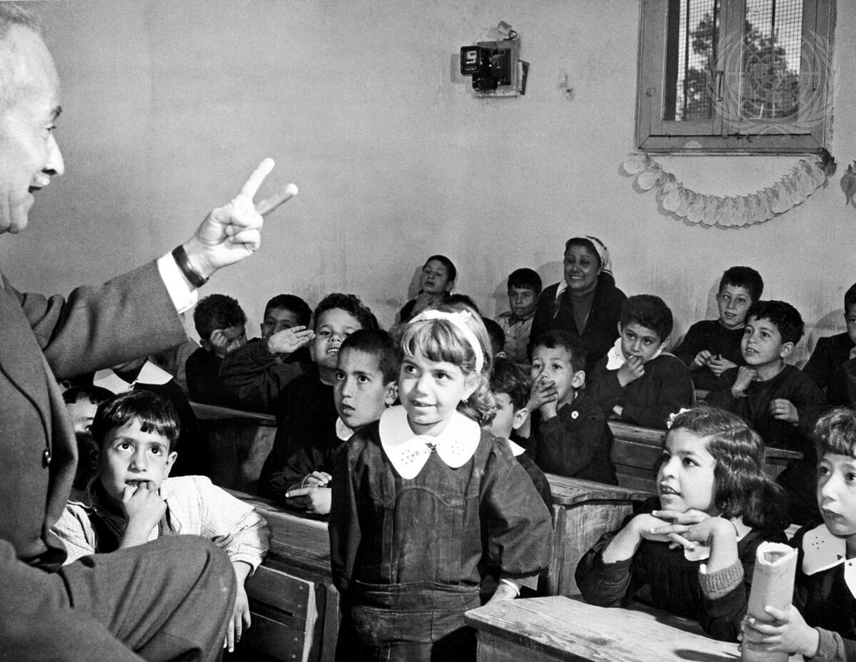 A total of some 176,000 refugee children are receiving elementary and secondary education; 123,000 in UNRWA/UNESCO schools and the rest - with the assistance of UNRWA - are attending State or private schools. A group of children in the 1st Grade at the Sabra School located on the outskirts of this city.