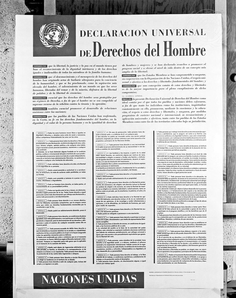 Spanish version of a poster depicting the Universal Declaration of Human Rights. The Declaration was adopted and proclaimed by United Nations General Assembly resolution 217 A III of 10 December 1948. [November 1949]