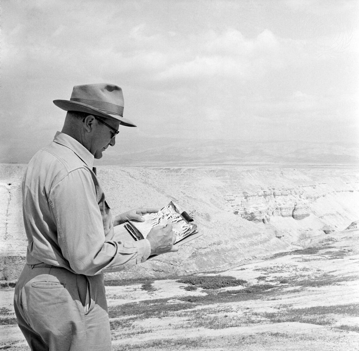The land classification of the Jordan Valley. More than 2,500 photographs taken during the aerial survey are examined on the spot, by David Bunger, Point IV agronomist. Later will come the detailed laboratory soil tests.