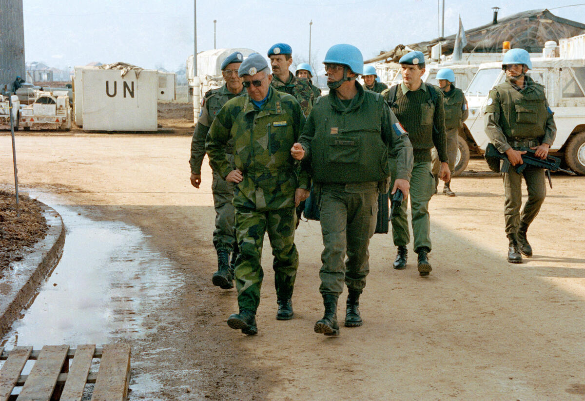 Lieutenant-General Lars-Eric Wahlgren (left, foreground), UNPROFOR Force Commander, and Lieutenant-General Philippe Morillon (far left, behind General Wahlgren), UNPROFOR's Bosnia-Herzegovina Commander, on their way to a meeting in Sarajevo. [April 1993]