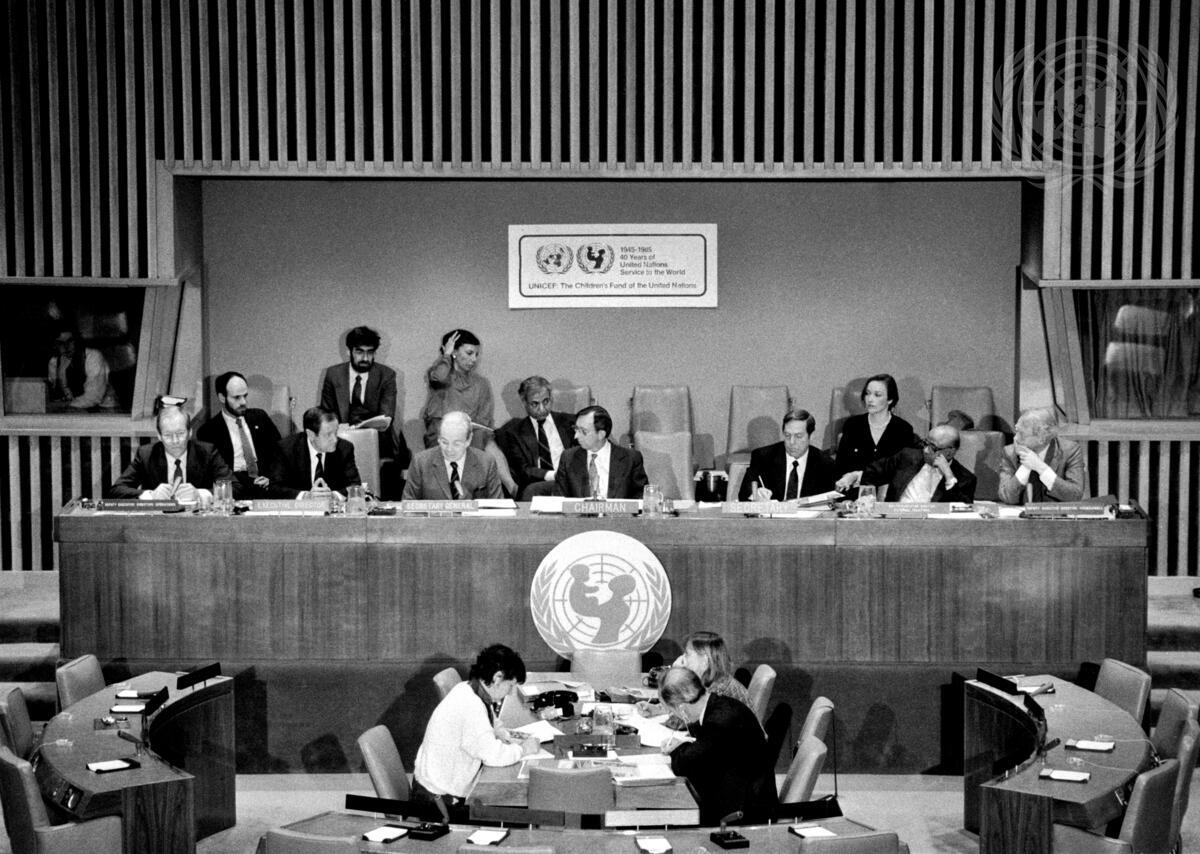 At the presiding table are (l to r) Karl-Eric Knutsson, Deputy Executive Director, Operations, UNICEF; James P. Grant, Executive Director of UNICEF; Secretary-General Javier Perez de Cuellar; Richard Manning (Australia), Chairman; Bertil Mathsson, Secretary of Board; Varindra T. Vittachi, Deputy Executive Director for External Relations of UNICEF; and Richard Jolly, Deputy Executive Director, Programmes, UNICEF