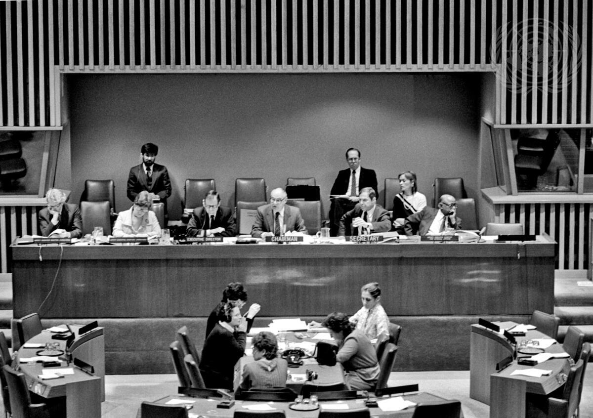 Seated at the presiding table this morning are, from left, Richard Jolly, UNICEF Deputy Executive Director, Programmes, Margaret Y. Catley-Carlson, UNICEF Deputy Executive Director, Operations; James P. Grant; Hugo Sheltema; Bertil Matesson, Executive Board Secretary; and Varinda T. Vittachi, UNICEF Deputy Executive Director, External Relations.