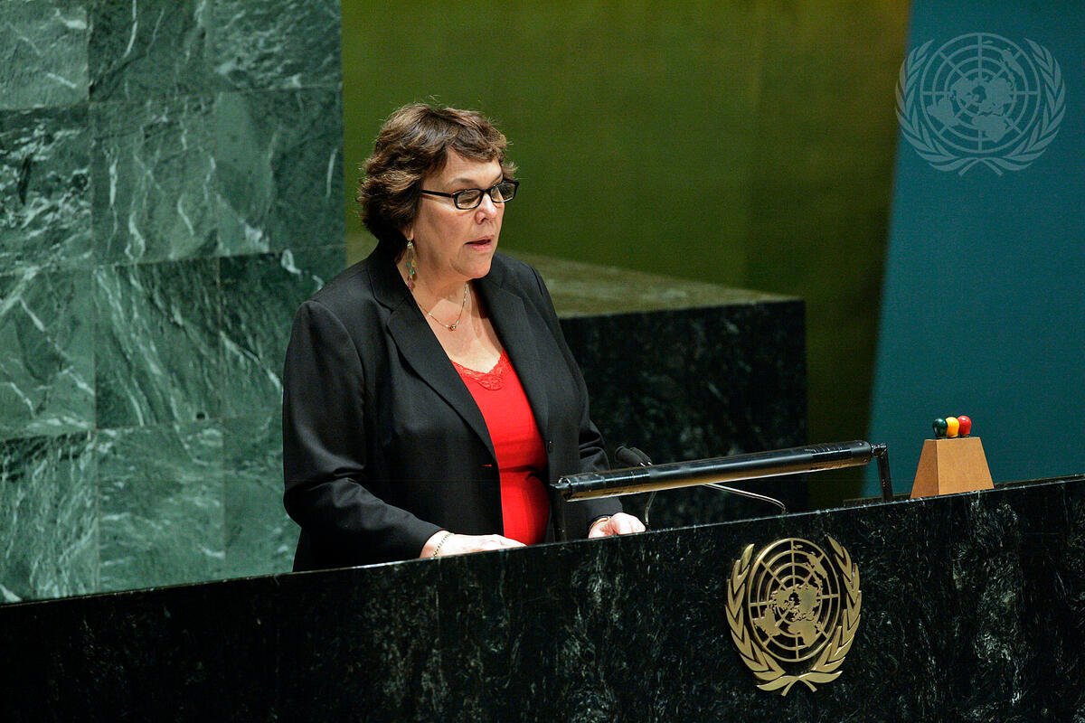 Margaret Hughes Ferrari, Permanent Representative of Saint Vincent and the Grenadines to the United Nations, introduces to the General Assembly the draft resolution on commemoration of the two-hundredth anniversary of the abolition of the Trans-Atlantic slave trade, on behalf of the Caribbean Community (CARICOM), today, at UN Headquarters in New York.