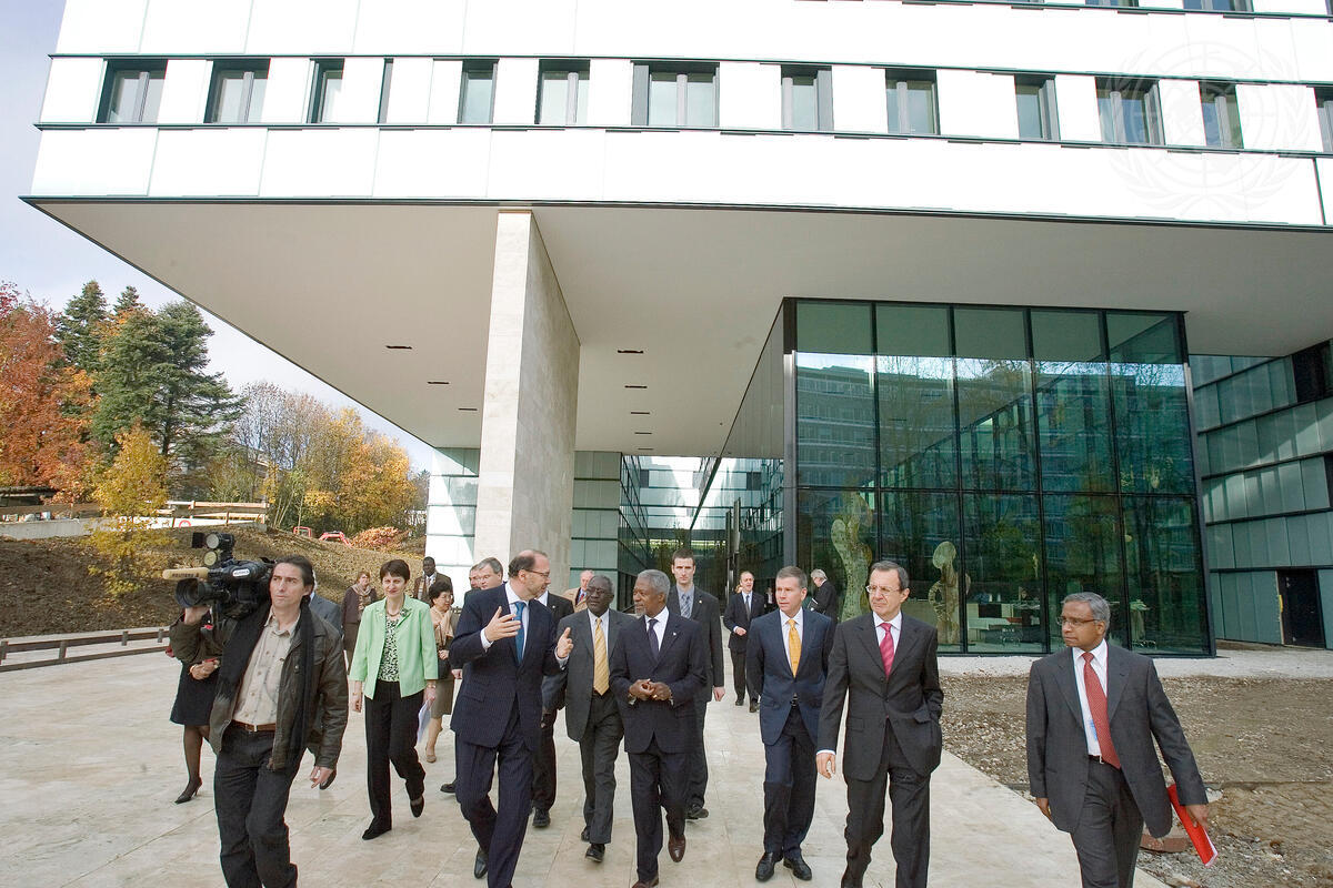 Secretary-General Kofi Annan (fourth from right), Peter Piot (sixth from right), Executive Director of UNAIDS; and Anders Nordström (third from right), Acting WHO Director-General, with a group of people walking in front of the new UNAIDS/WHO building in Geneva, Switzerland, after the inauguration.