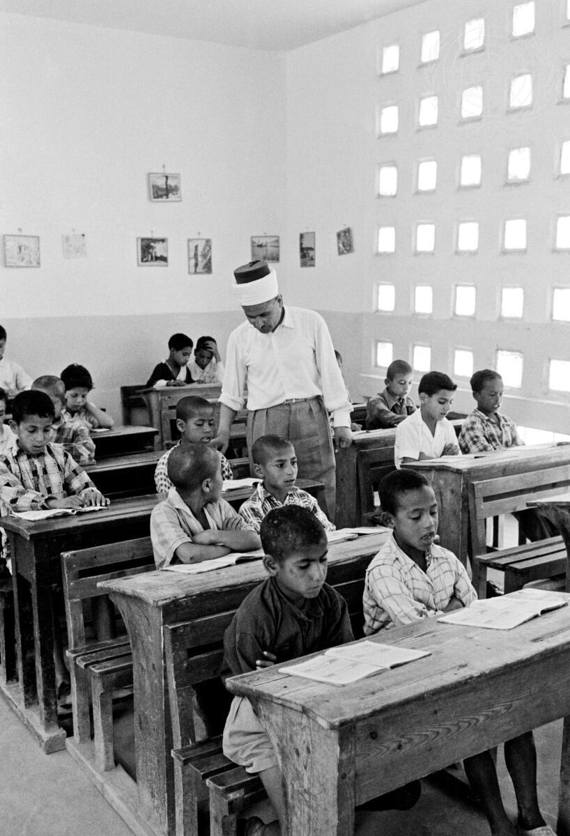 Refugee children photographed in a 3rd elementary class during a lesson on religion. The Sheikh is teaching the Koran. Education is a major part of UNRWA's program in the Middle East camps - altogether 390 UNRWA schools provide 12 years of education for 187,000 refugee pupils.
