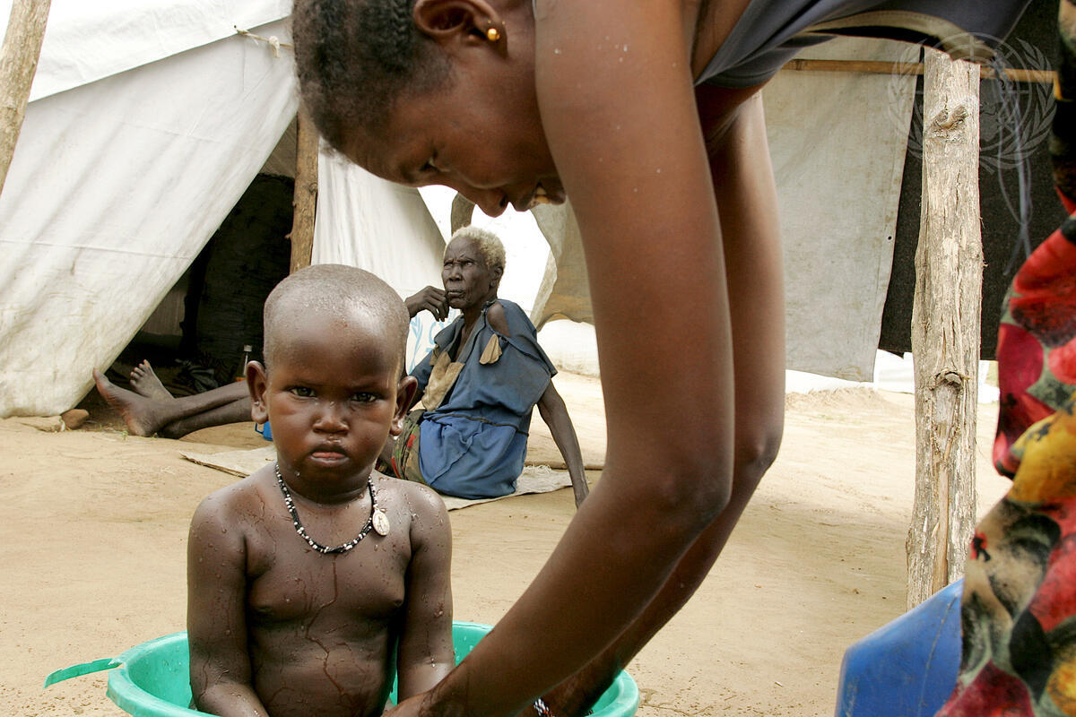 A mother living in the Lologo camp of the Internally Displaced Persons (IDP) bathes a young Dinka Bor child.