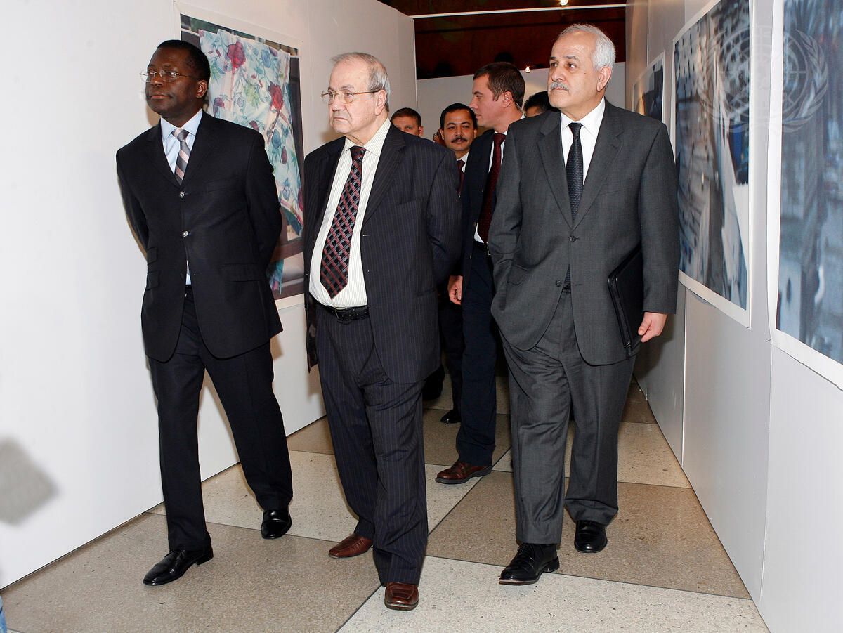 Left to right, Paul Badji, Permanent Representative of Senegal to the United Nations and Chairman of the Committee on the Exercise of the Inalienable Rights of the Palestinian People; Farouk Assaad Kaddoumi, Head of the Political Department of the Palestine Liberation Organization; and Riyad H. Mansour, Permanent Observer of the Permanent Observer Mission of Palestine to the United Nations, tour an exhibit entitled ""Contextualization: A Palestinian Narrative"". The exhibit is organized by the Committee on the Exercise of the Inalienable Rights of the Palestinian People, in cooperation with the Permanent Observer Mission of Palestine on the occasion of the International Day of Solidarity with the Palestinian people, at UN Headquarters in New York.