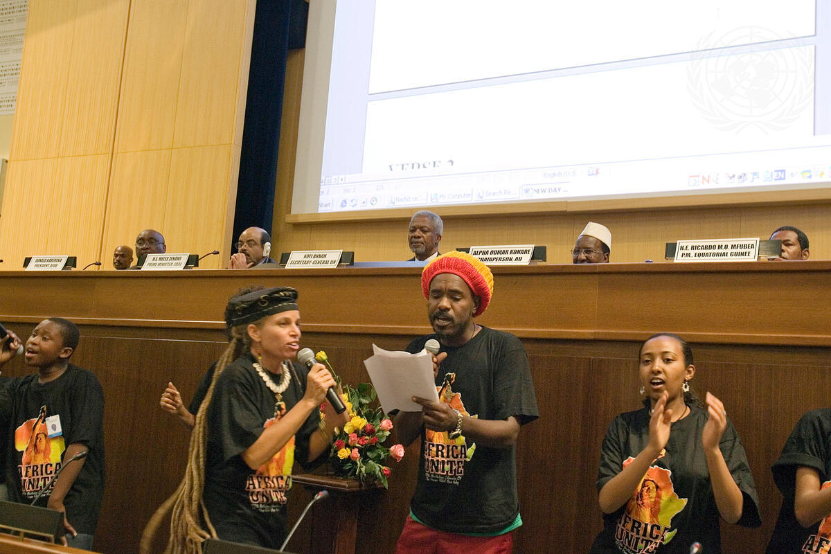 A group of young performers entertain the audience at a joint United Nations Economic Commission for Africa (ECA)/African Union Commission (AUC) ceremony, in honour of Secretary-General Kofi Annan, (third from right, top) in Addis Ababa, Ethiopia.