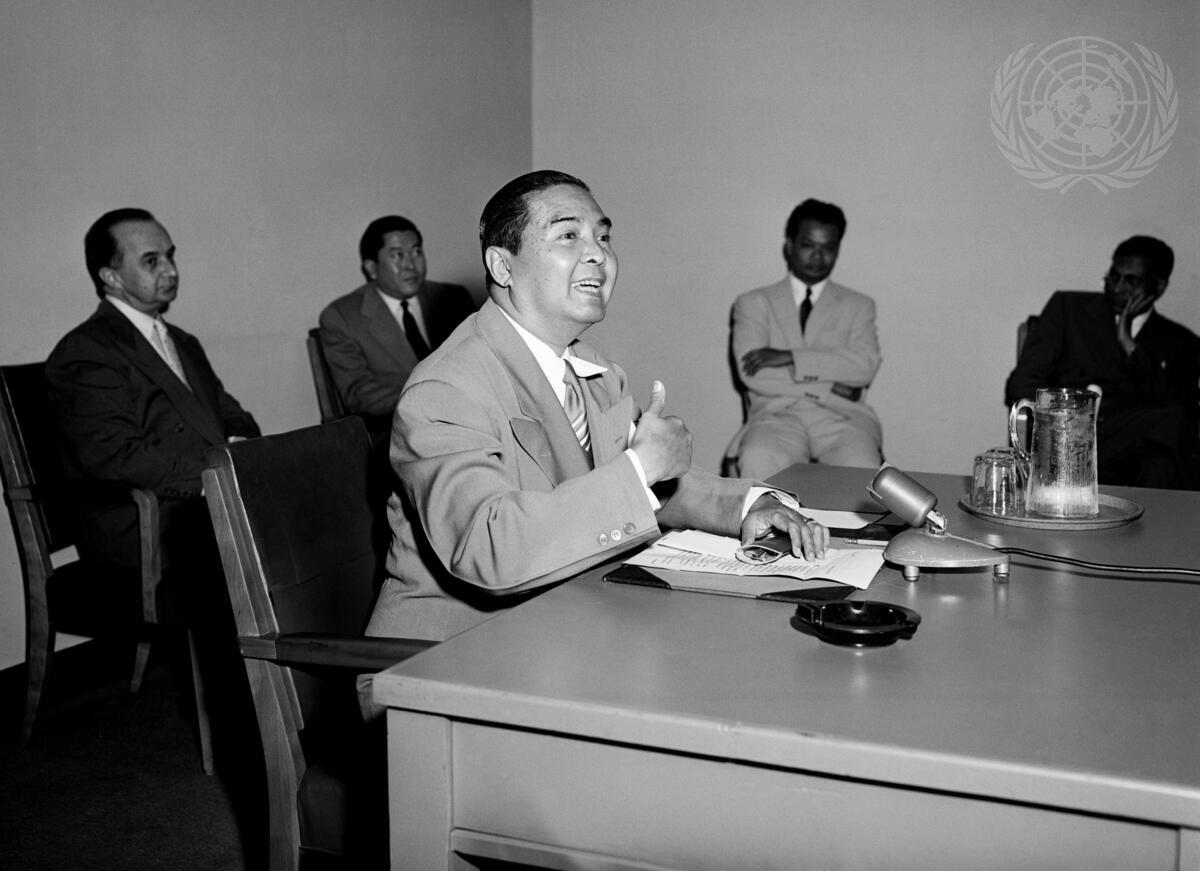 Prince Wan Waithayokon (at desk), Permanent Representative of Thailand to the United Nations, answers a question from the floor during a press conference at U.N. Headquarters today. Earlier in the day, Thailand proposed that the recessed eighth session of the General Assembly be reconvened to consider placing upon its agenda as an additional item the Thai request for the dispatch of U.N. observers which was vetoed by the Soviet Union in the Security Council on 18 June. With regard to the date of the proposed recall, Prince Wan explained that his Government wished to wait and see what developments occurred at the Geneva conference, stating that ""Thailand would be the first to welcome a satisfactory settlement of the situation in Indochina, because we are as anxious as any other nation that peace should be re-established in that region"".